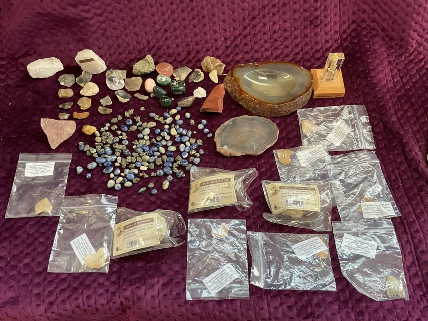 A carved soapstone elephant, three carved wise monkeys, an onyx pyramid, lion and bust, ceramic shanti figures, replica Egyptian tomb painting plaques, and a collection of mineral specimens. (A lot)