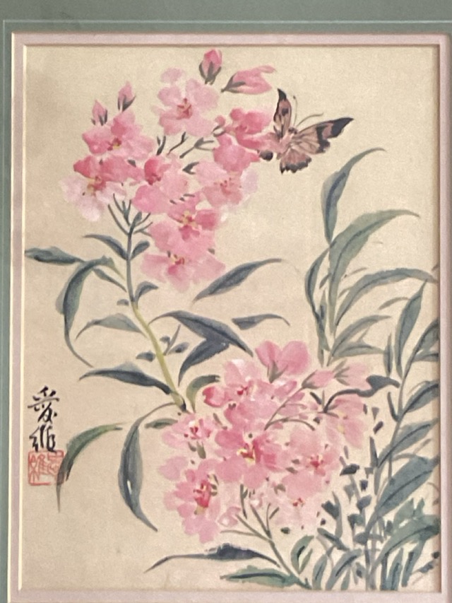 Chinese school, coloured prints, a set of three studies of flowering plants with butterflies, signed with characters in the prints, mounted, and in gilt faux bamboo frames. (8.75in x 12.5in) (3)