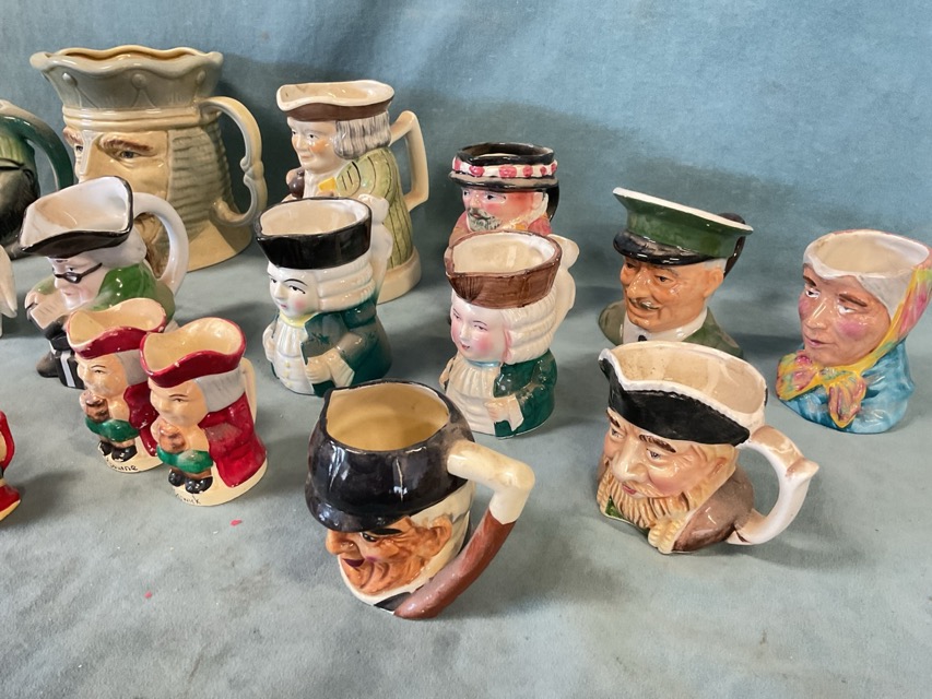 A collection of character & toby jugs - Kingston Pottery William the Conqueror, Shorter & Son beefeater, Carlton Ware Harrods commissionaire, pirates, aldermen, huntsman, etc. (24)