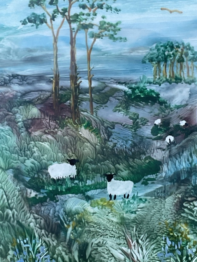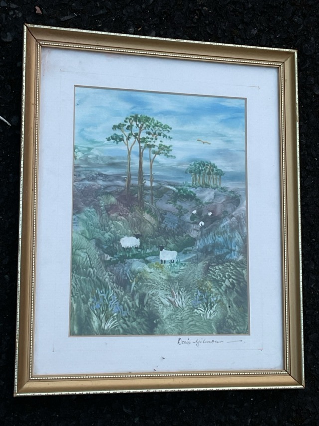 Doris Gilmour, resist oil on panel, landscape with sheep, signed to mount and artists label to verso, mounted & gilt framed. (5.5in x 7.5in)