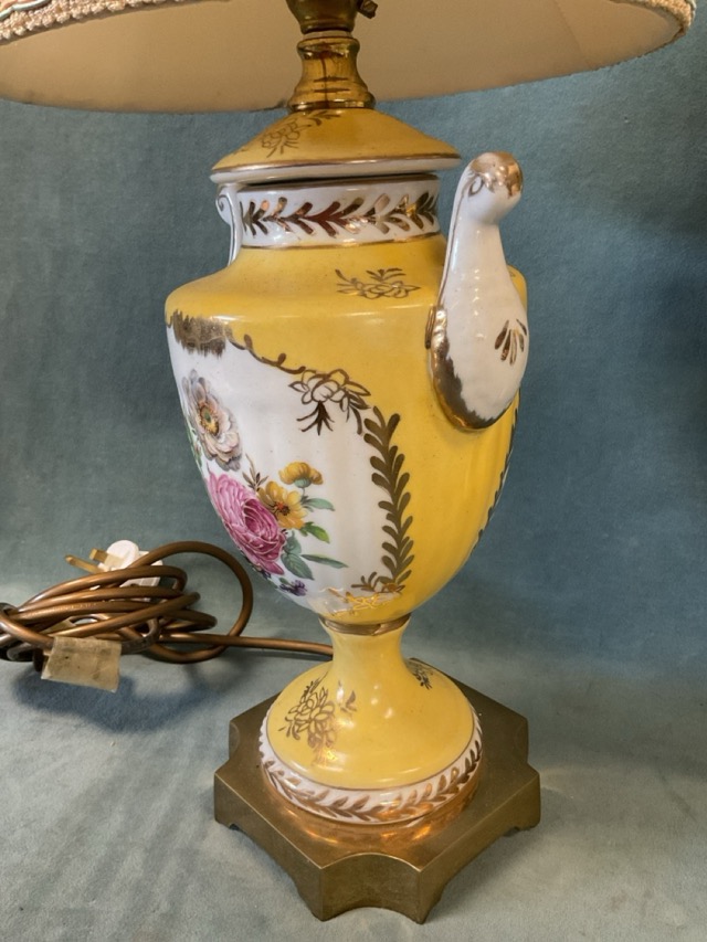 A pair of Coalport style tablelamps decorated with polychrome floral panels framed by gilding on yellow ground, raised on brass plinths - both with pleated shades. (18.5in) (2)