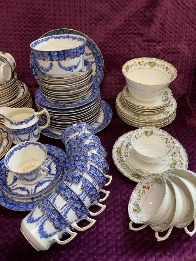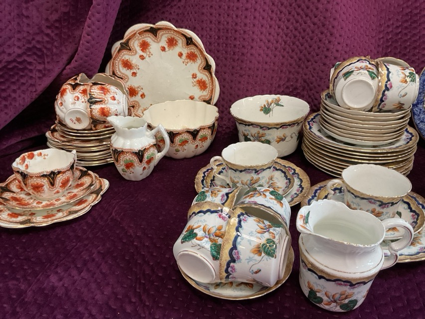 Four part teasets - Victorian blue & white in the garland daisy pattern, Tuscan hand enamelled with fruit & flowers, poor mans derby style, and Edwardian lustre glazed with gilded leaves. (4)