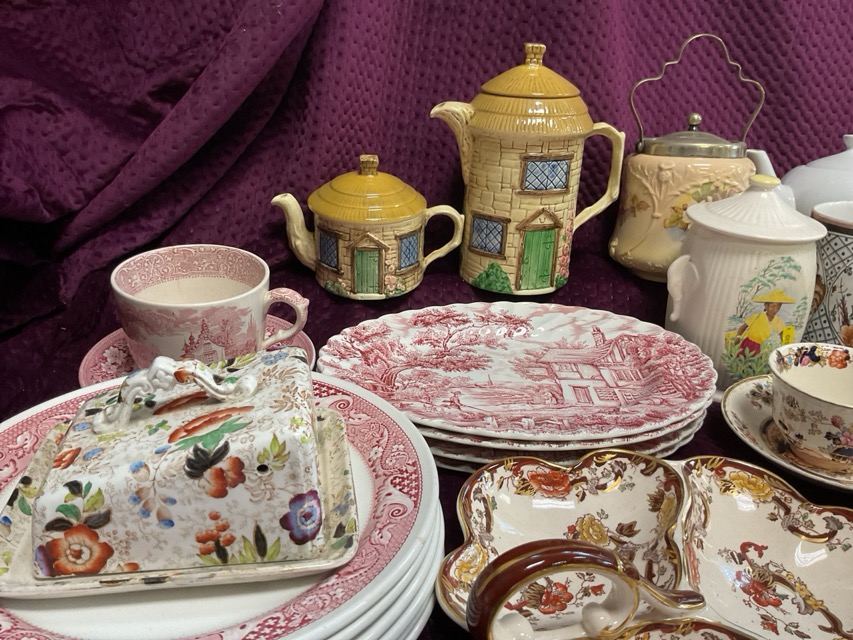 Miscellaneous ceramics - pink transfer printed ware, Masons, a large Portuguese tankard, cheese dishes & covers, tea & coffee pots, a Price hen tureen & cover, biscuit barrels, etc. (A lot)