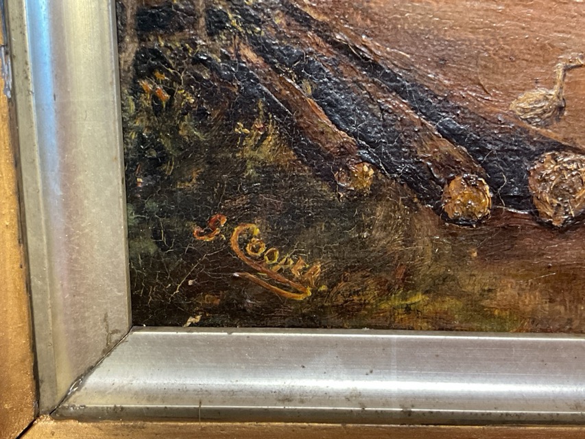 J Cooper, oil on canvas, rural cottage scene with thatched buildings, figures, chickens, cows, ducks, etc., signed, inscribed in pencil on stretcher The Old Smithy Omy Hants, foliate gilt framed. (13.5in x 9.5in)