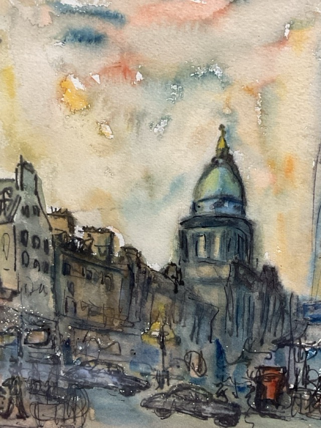 Pen, ink & watercolour wash, streetscape with figures & cars, signed with initials AAG, mounted and oak framed. (9.75in x 9.75in)