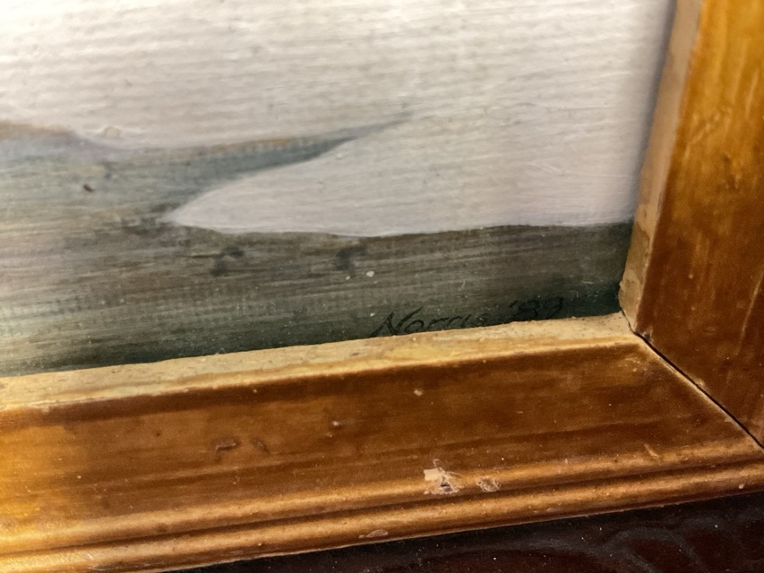 Manuella Norris, watercolour, winter landscape scene after Pieter Bruegel the Elder, signed, in carved frame with gilt slip. (20.75in x 16.75in)