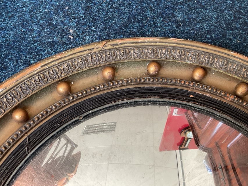 A circular regency style convex gilt framed mirror, the gesso scroll moulded frame with ribbon moulding having applied balls, with interior ebonised ribbed slip. (19.5in dia)