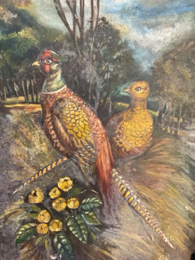 Manualla Norris, oil on board, study of a kilted falconer with bird, signed & framed; and an unframed oil by the same hand depicting pheasants, inscribed to verso Alness 1972. (2)