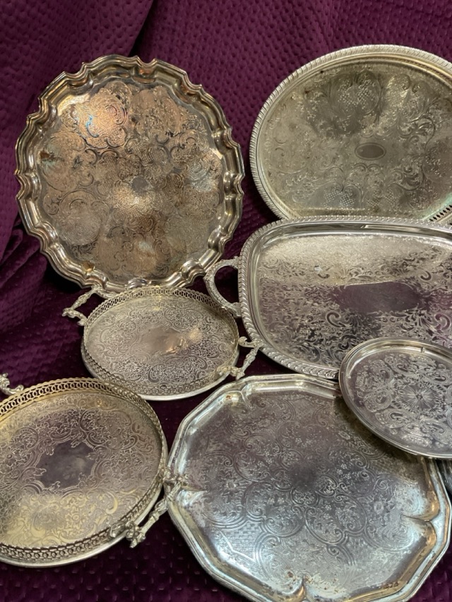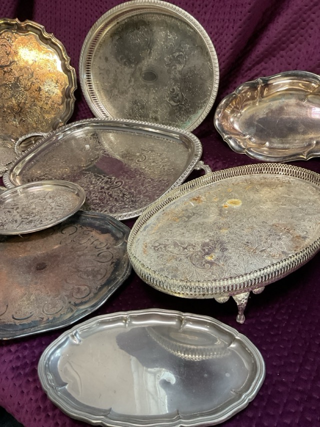 Ten silver plated trays & salvers - circular, gadroon rim moulded, gallery type, oval, engraved on feet, scalloped, etc. (10)