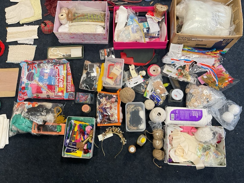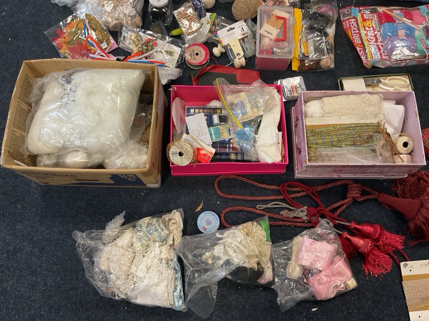 A collection of textile craft & sewing materials - yarns, threads, fabric leaves and flowers, stuffing, mohair dolls hair, rolls of antique handmade and machine-made lace, ribbons, trimmings, beads, a knitting kit, boxed pinking shears, etc. (A lot)