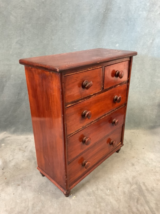 A miniature Victorian mahogany chest of drawers with rectangular top above five knobbed drawers, raised on turned feet. (13.5in x 6.25in x 16in)