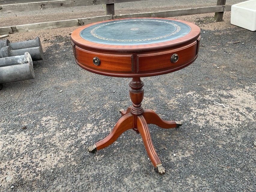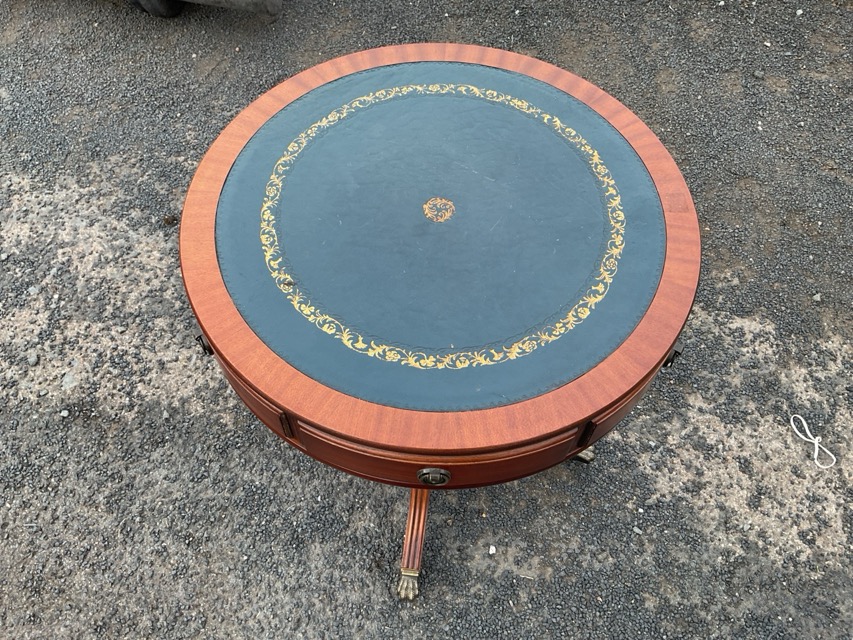 A regency style drum table, with gilt tooled leather skiver to top above a frieze with two brass ring handled drawers, on a turned column with reeded sabre legs and brass lions paw castors. (19.5in x 19.5in x 23in)