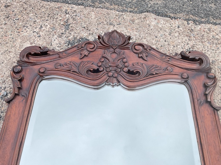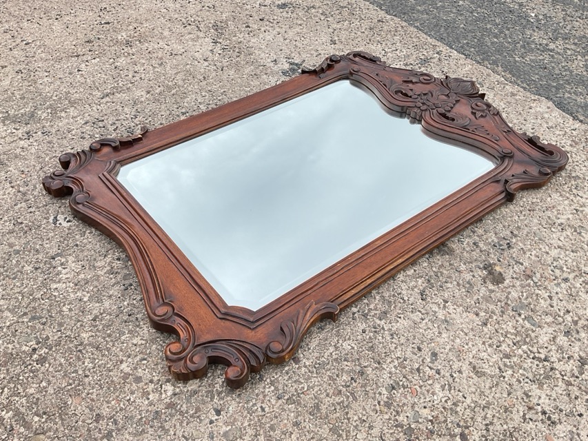 A Victorian style mahogany mirror with scrolled foliate carved frame enclosing a conforming shaped bevelled plate. (46in x 30.5in)