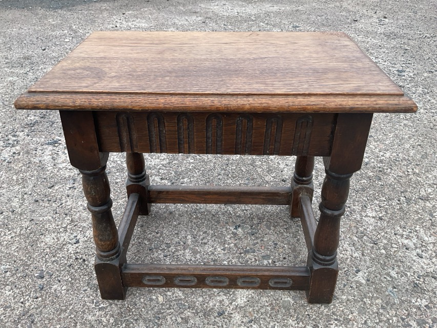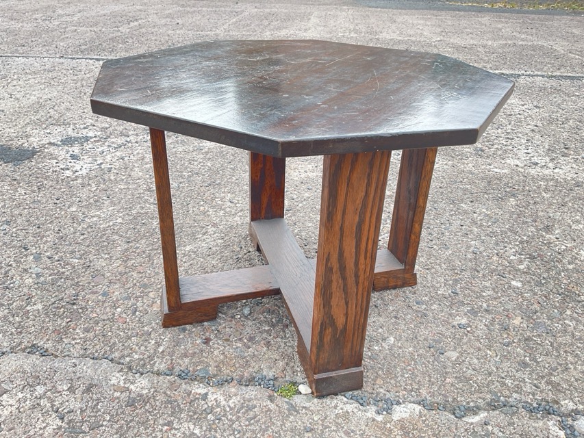 An octagonal deco mahogany & oak coffee table on rectangular legs joined by a cruciform stretcher; and a Jacobean style oak joint stool with rectangular moulded top above a fluted apron raised on turned legs joined by stretchers.(2)