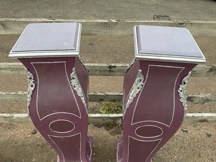 A pair of ghastly tasteless jardinière stands of square bulbous waisted form having silvered decoration on purple ground, raised on twee bracket feet. (44.5in) (2)