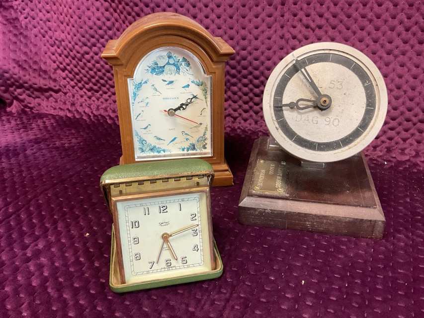 An unusual presentation clock on moulded mahogany stand formed from an engineering part, the plaque reading Johnny Morris A Good Workmate; three modern brass carriage type clocks; a cased Smiths travel clock; and a chirpy bird clock. (6)