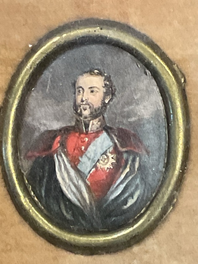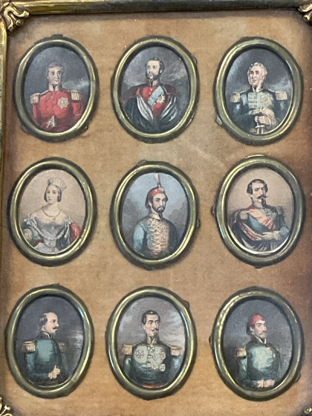 A framed set of nine Baxter print portraits of Crimean War allied leaders - Lord Raglan, the Duke of Cambridge, Sir Charles Napier, Queen Victoria, the Sultan of Turkey, Napoleon III, Marshal Canrobert, Marshal St Arnaud, and Omar Pasha, in period velvet mount. (each 1in x 1.25in)