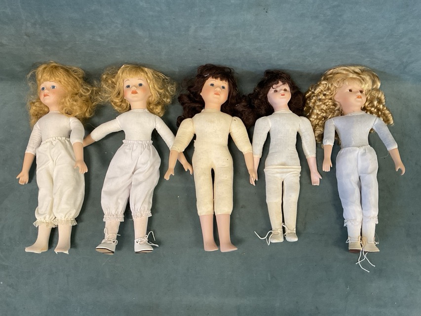 A collection of nine cloth bodied undressed dolls with porcelain heads and limbs, glass eyes and artificial hair wigs. (9)