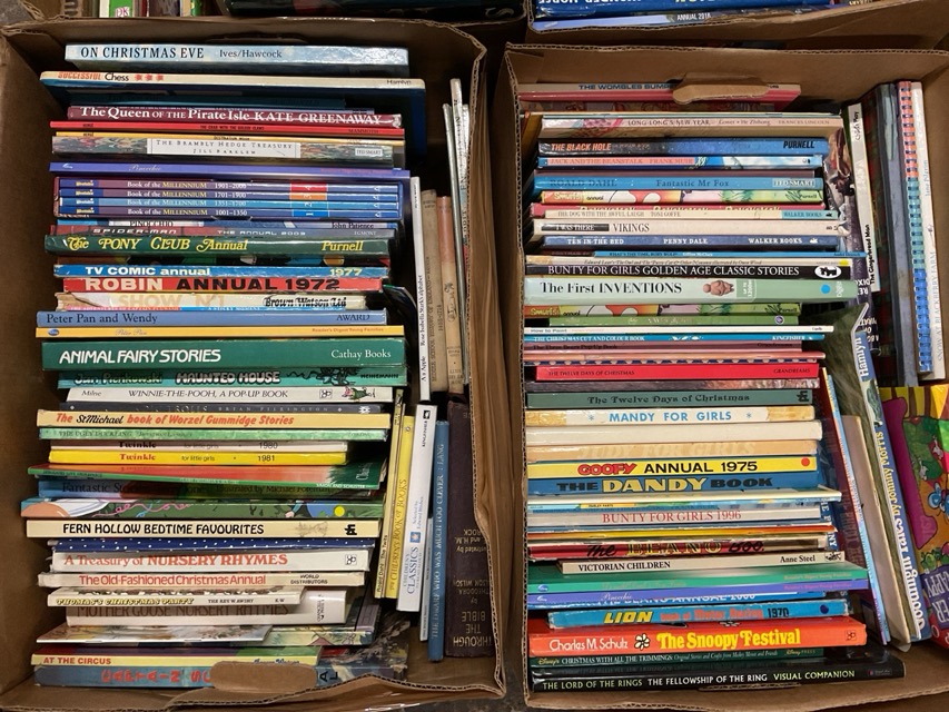 A quantity of childrens books - annuals, some C20th canvas spined, fairy tales, sets, comics, teddy bears & toys, history, pop-up books, Enid Blyton, science, etc. (210+)