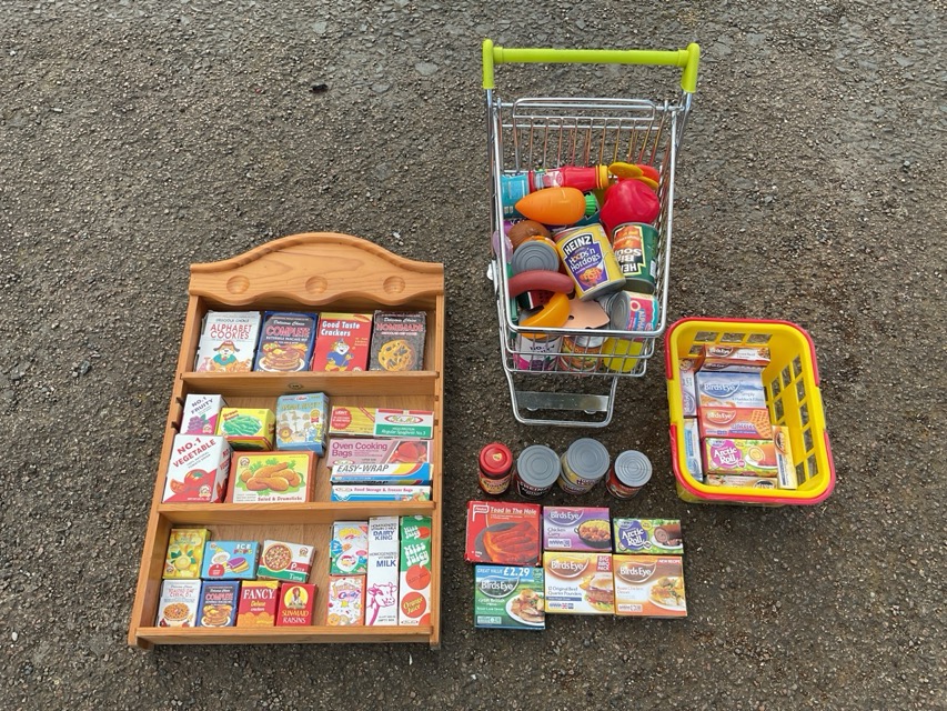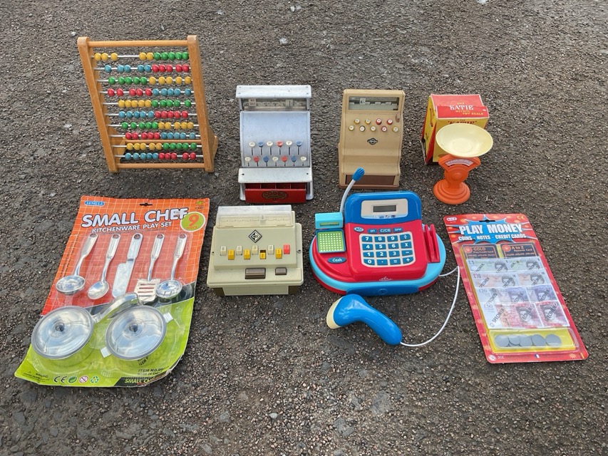 A collection of shop and kitchenware play sets - a display shelf, scales, abacus, play money, kitchen utensils, shopping trolley & basket, registers, miniature brand products, food, etc. (12)