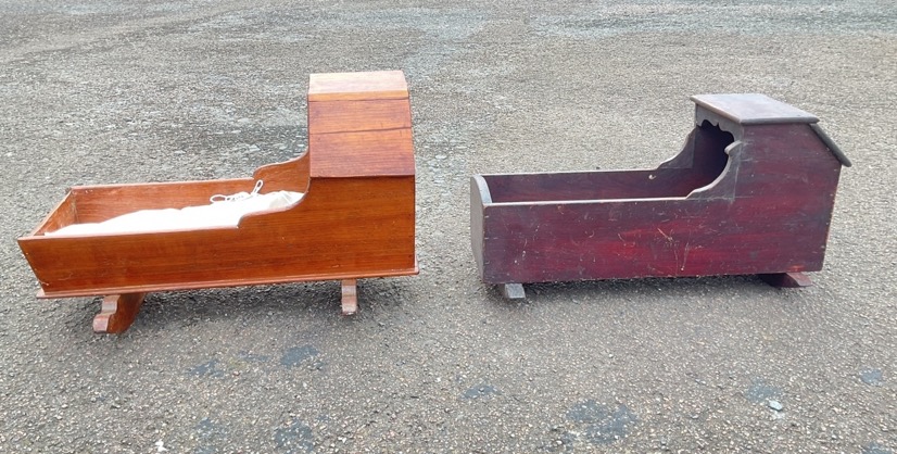 Three Victorian pine dolls cradles, two with pitched hoods and one with arched cover above rectangular bodies on curved rockers; and an oval cane dolls cradle with hood, etc. (4)