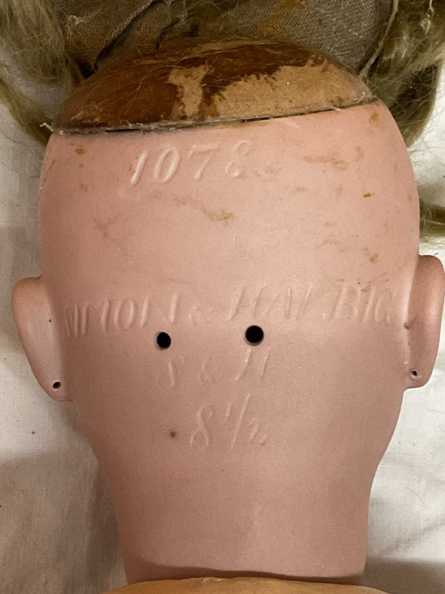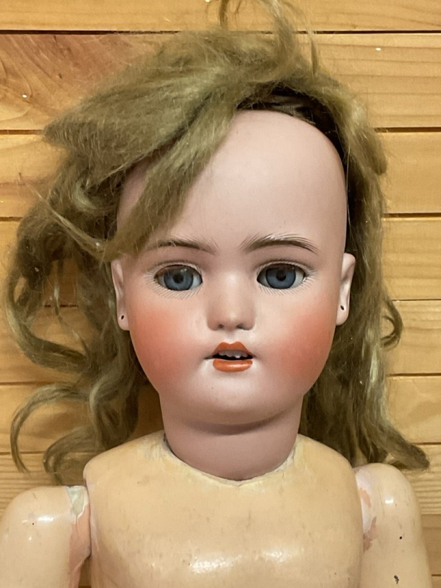 A Simon and Halbig bisque head doll with original mohair wig, composition body and articulated limbs, wearing socks and kid shoes. (22in)