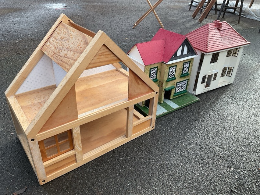 Three dolls houses - metal with sliding front, a timbered type house, and modern open plan building. (3)