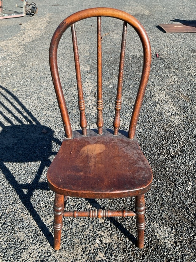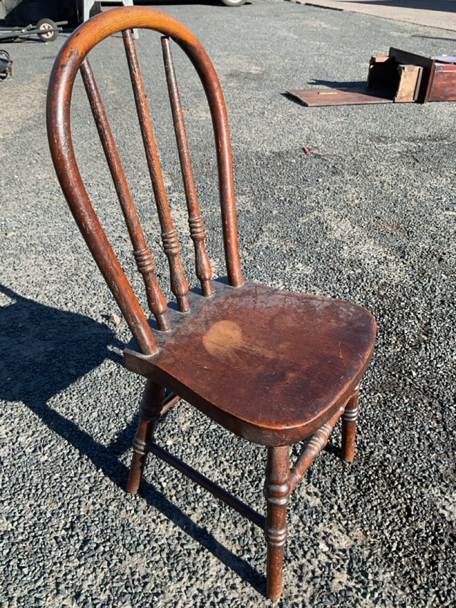 An antique childs windsor type oak chair with hooped back on ring-turned spindles, the solid seat on turned legs & stretchers.