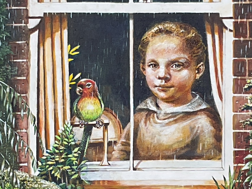 Manuella Norris, oil on board, a boy and parakeet looking out of a window into the garden on a rainy day, unsigned. (15.75in x 24in)