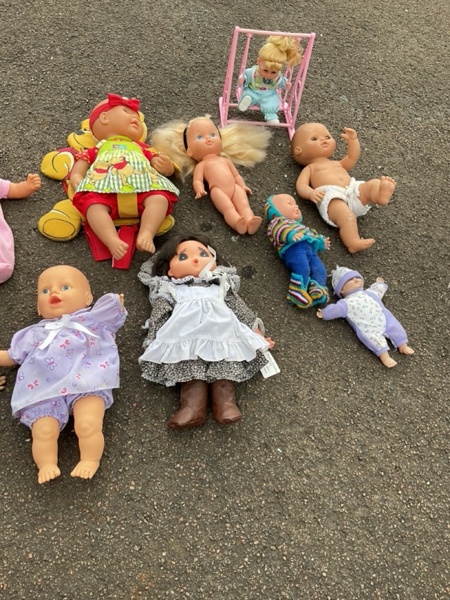 A collection of 70s, 80s and 90s plastic dolls, some with cloth bodies including a 1979 Sophie Suckathumb, a Berchet talking doll, a Disney Winnie the Pooh backpack doll, a musical doll in a swing, etc. (15)