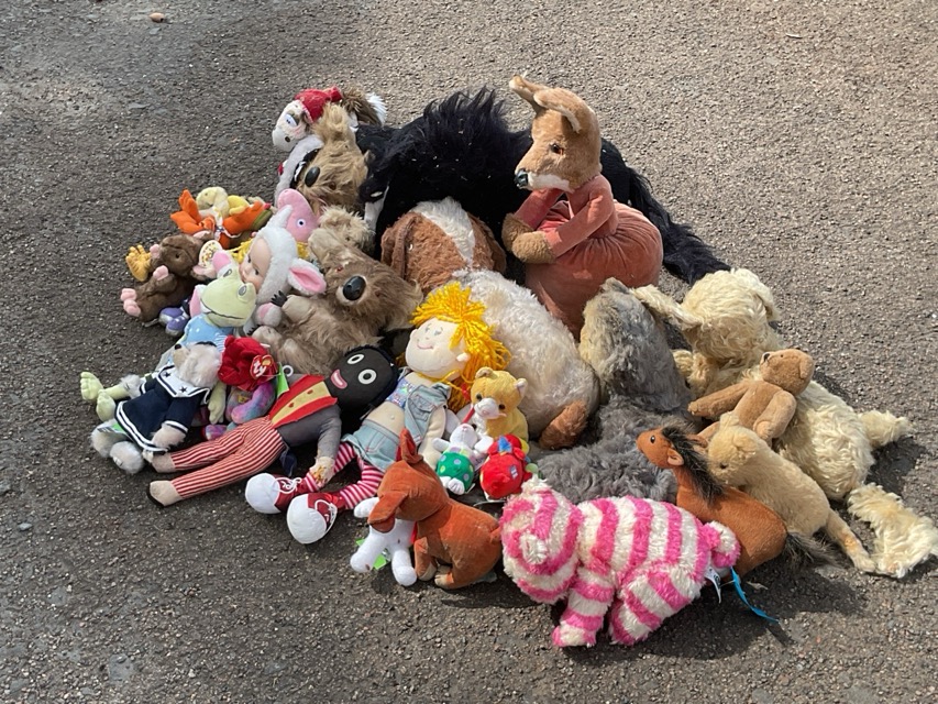 A collection of thirty soft toys and pyjama cases - rag dolls, a golly, Bagpuss, a fox doorstop, bears, horses, rabbits, koalas, dogs, etc. (30)