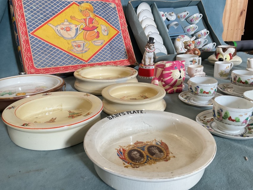 A collection of childrens ceramics - a 50s boxed teaset, a 60s Noddy teaset, a porcelain teaset decorated with dutch scenes, a Bagpuss toothbrush holder, a Sooty eggcup, mugs, babys plates, a Mabel Lucie Atwell warming plate, etc. (A lot)