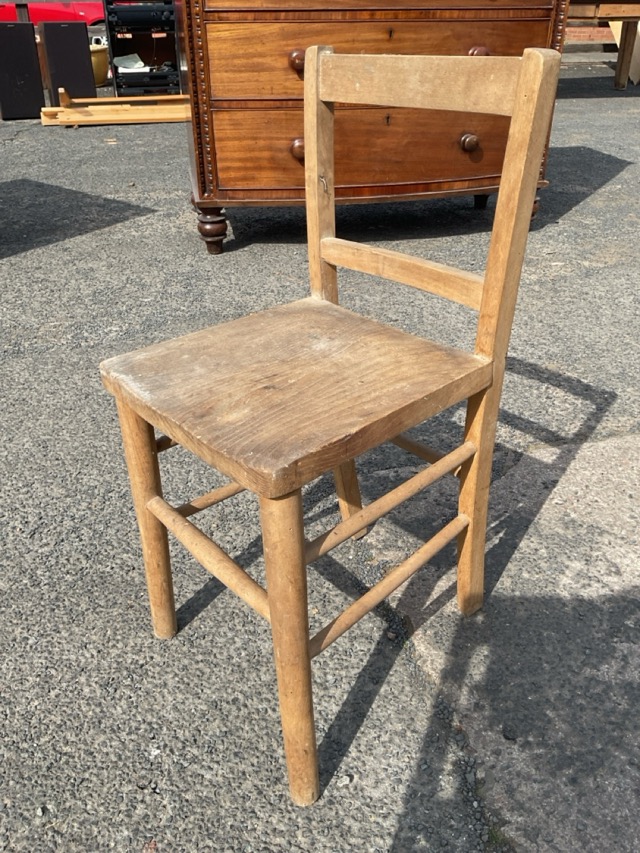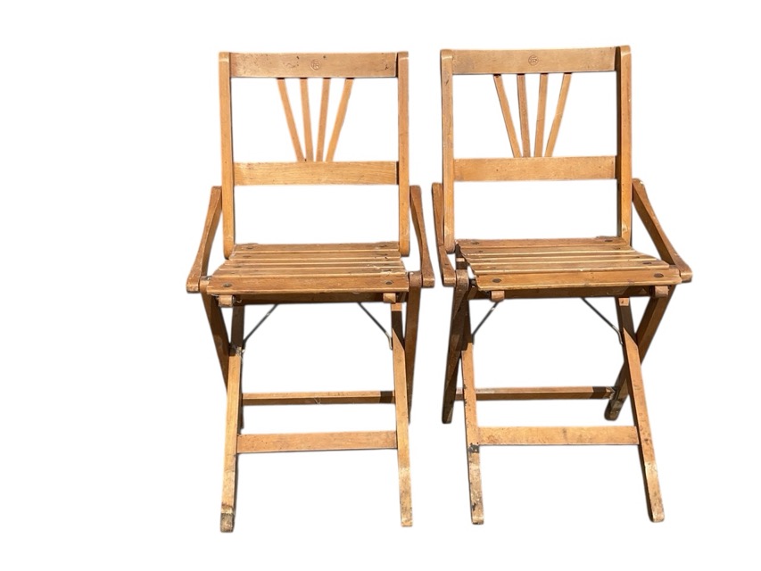 A pair of childrens chairs with fan shaped lathe backs above slatted seats on folding rectangular legs; and a single elm barback chair on turned legs & stretchers. (2)