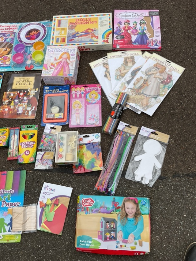 A collection of childrens activity sets and craft materials - paper dolls, a bead kit, muffin making set, paper aeroplanes, painting & wood model kits, packs of card, plasticine, crayons, coloured pencils, goggly eyes, gem crafts, etc. (A lot)