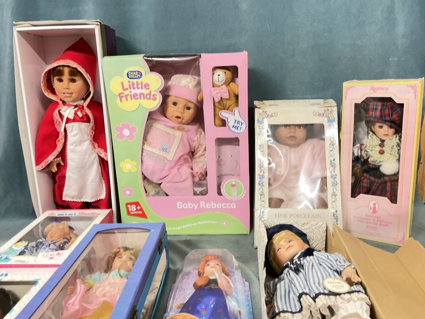Nine boxed dolls - MCA Creations Red Riding Hood, Chad Valley Baby Rebecca, Regency Fine Arts porcelain doll, Scottish costume dolls, Kirsty, French Corolle dolls, a Collectors Choice porcelain doll, Disney Frozen Anna, and an Alberon porcelain doll in a sailor suit. (9)