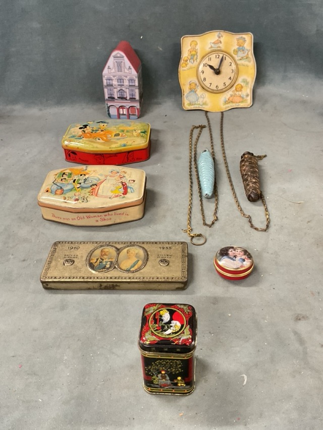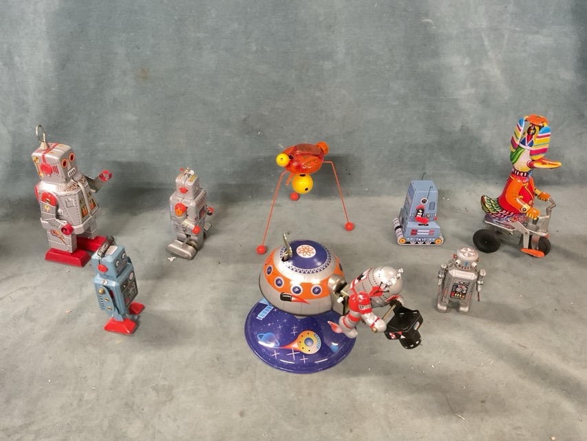 A collection of tins and clockwork toys - boxed robots, a boxed Happy Wanderer duck on a tricycle, a jiggling tripod alien, a Mars-1 flying saucer and robot, a Chad Valley nursery rhyme wall clock, Horner toffee tins, a 1935 jubilee chocolate tin, etc. (15)