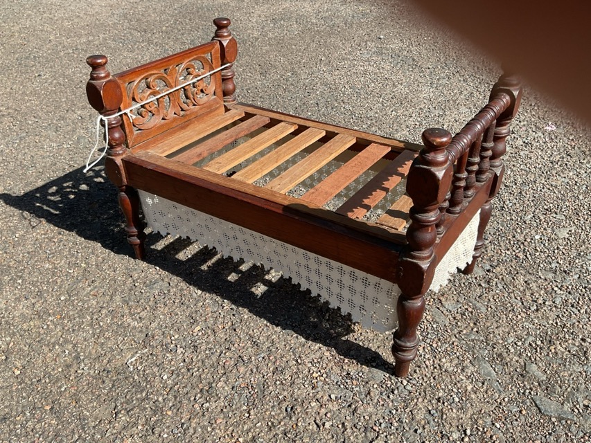 A Victorian mahogany dolls bed with pierced carved headboard, spindle turned footboard and slatted base; two similar cane dolls cradles; and an antique pine cradle of nailed plank construction with shaped head & footboards. (4)