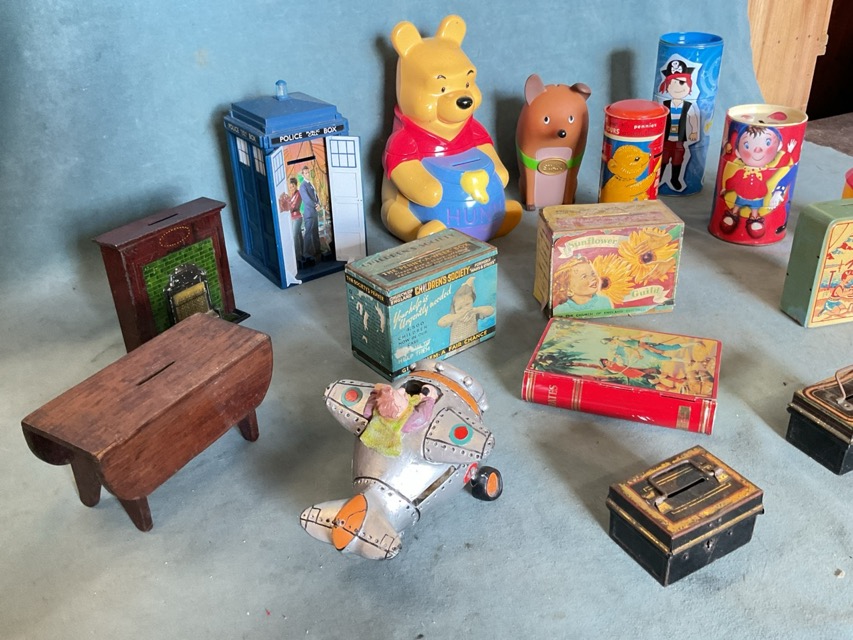 A collection of money boxes - an Edwardian fireplace, a Dr Who phonebox, Disney Winnie-the-Pooh, an oak cracket, 50s CofE Childrens Society and Sunflower Guild charity boxes, Noddy and Nikki the Bear, miniature cashboxes, tinplate, wood, etc. (17)