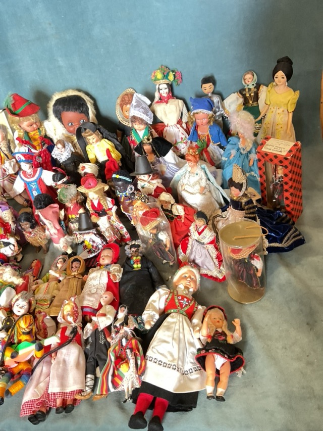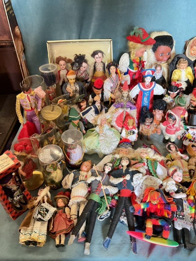 A collection of international costume dolls - three antique Jules Steiner porcelain heads, French, Greece, Germany, Native American, Inuit, Switzerland, Wales, Barbados, Russia, UK, Spain, Netherlands, Malta, South Africa, Scandinavia, Middle East, etc. (A lot)
