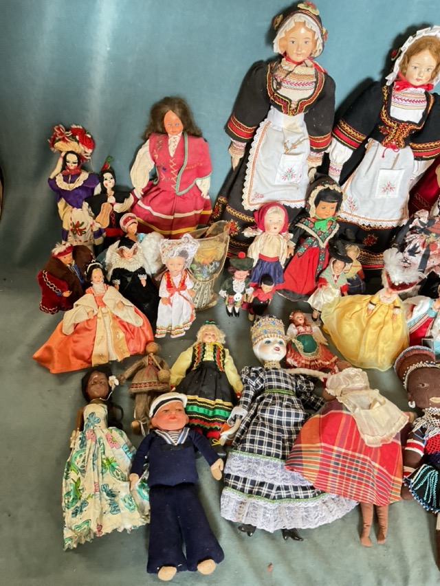 A collection of costume dolls - large Swiss dolls with painted faces, a Norah Wellings sailor, Peggy Nisbet historical figures, porcelain, cloth and flax fibre Russian examples, a handmade commemorative doll from the 1953 Royal visit to Jamaica, Welsh, African, Madeiran and others, etc. (31)