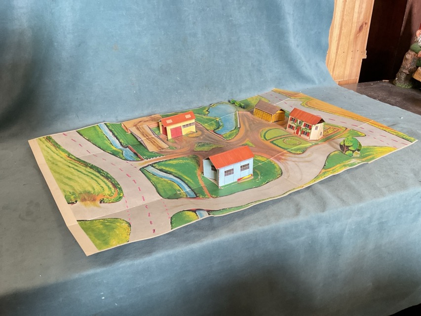 Miscellaneous transport toys - a 50s cardboard pop-up farm diorama with buildings and roads, Mettoy tinplate railway station, tunnel and tracks, Hornby O-gauge tracks, turntable and LMS guards van, a diecast Percy the Saddletank, five boxed delivery vans, a Matchbox truck, etc. (A lot)