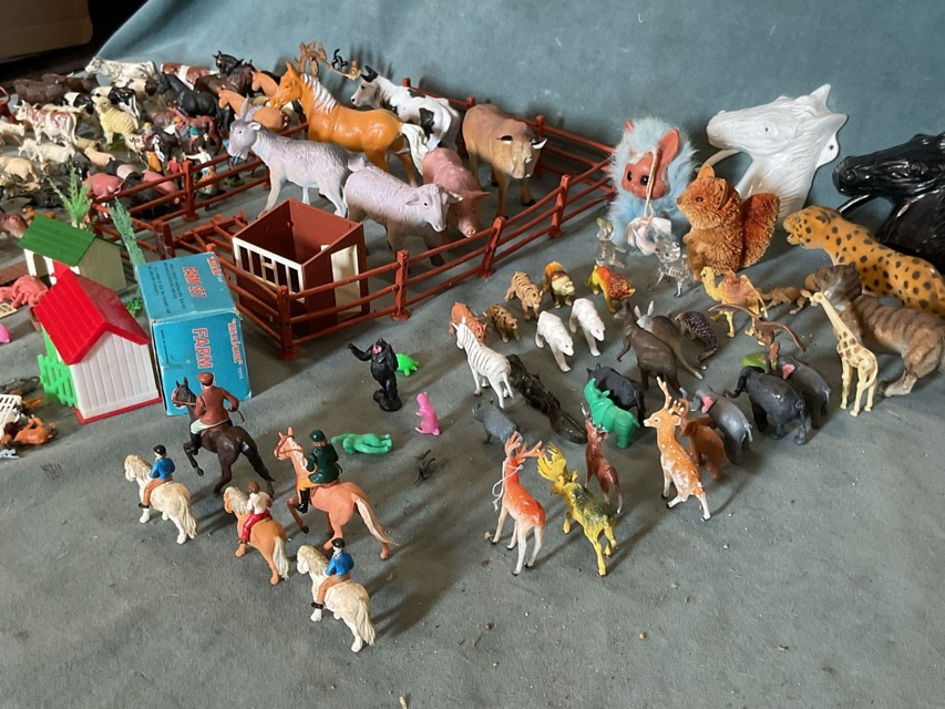A collection of Britains and other farm and zoo animals and figures - farmers, cows, sheep, goats, pigs, horses, dogs, rabbits, fowl, lions, tigers, elephants, deer, bears, apes, zebra, giraffe, rhinos, a boxed pocket farm set, a family riding horses, soldiers, etc. (A lot)