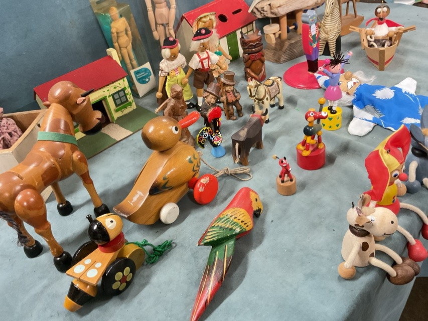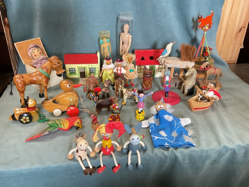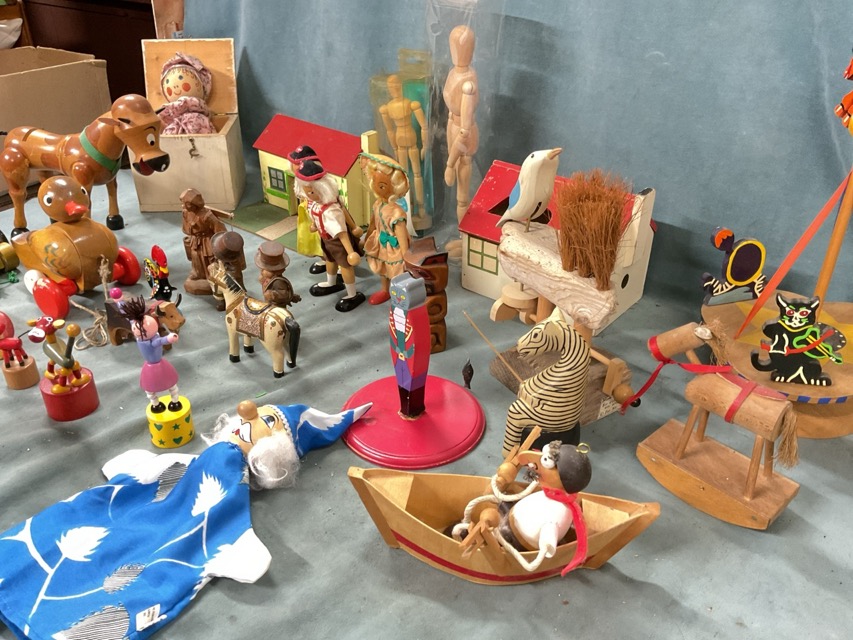 A collection of wood toys and figures - a jack-in-the-box, lay figures, a peg-in-the-hole house game, a hey-diddle-diddle spinning maypole, a driftwood seagull automaton, pull-along animals, a cow moneybox, jumping jacks, Swiss dolls, a wizard glove puppet, etc. (A lot)
