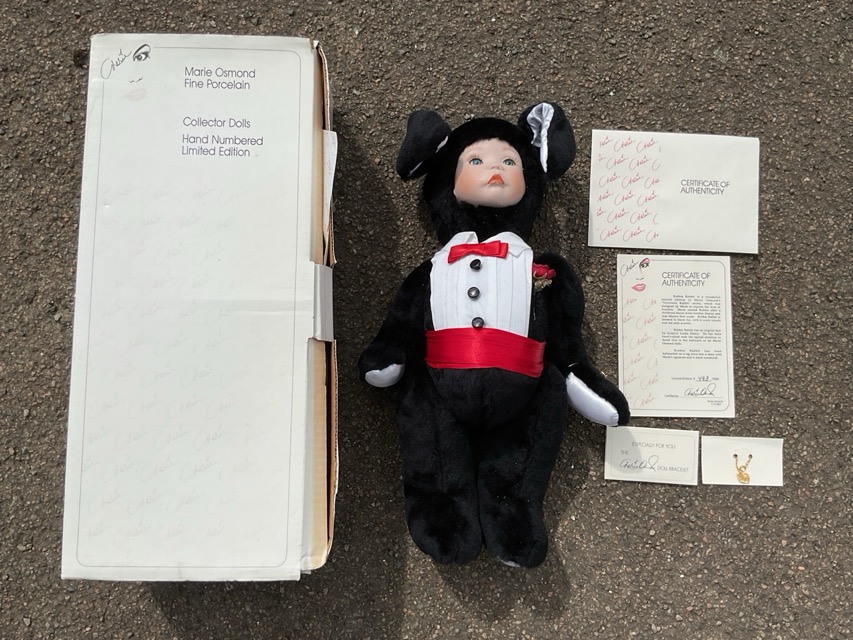 Eight boxed dolls - Marie Osmond named Robbie Rabbit with certificate & braclet, a Butterfly Ring by Paradise Galleries, porcelain dolls by Leonardo, a New Zealand by Pedigree, a Vanity Fair by Stewart Ross, a porcelain in a satin pink dress with bicycle, etc. (8)