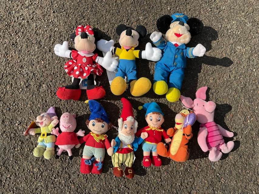 Miscellaneous soft toys - elephants, tigers, frogs, birds, rabbits, bears, Mickey mouses, teletubbies, Noddys, Winnie the Pooh characters, Sooty, Shaun the Sheep, Beatrix Potter, Jellycat, Ty, Disney, etc. (A lot)