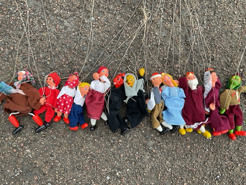 Miscellaneous puppets - an eastern handpainted Wajang, Punch & Judy with wood hands & faces, stick puppets, an indian elephant, a Muffin the Mule marionette, wire puppets, a handmade Mexican dance of the flyers, etc. (40)