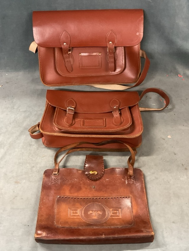 A collection of leather childrens satchels & suitcases - bags with shoulder straps, a hand-tooled case, wallets, a Crowns suitcase, a dolls case, etc. (8)