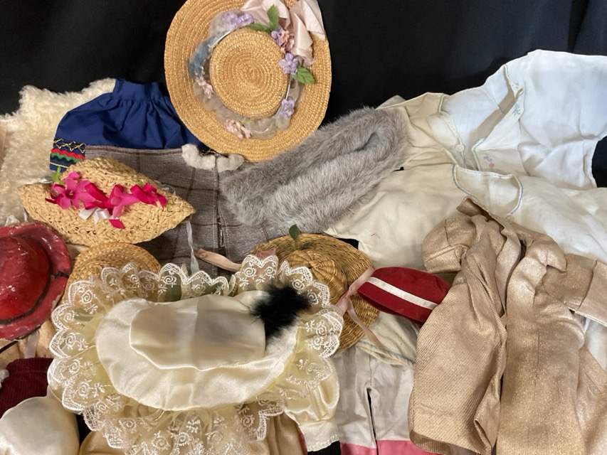 Miscellaneous dolls clothes - dresses, lace, pantaloons, straw hats, faux fur, wigs, jackets, bonnets, trousers, etc. (A lot)