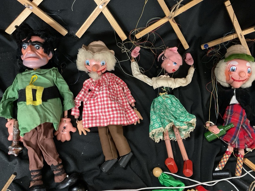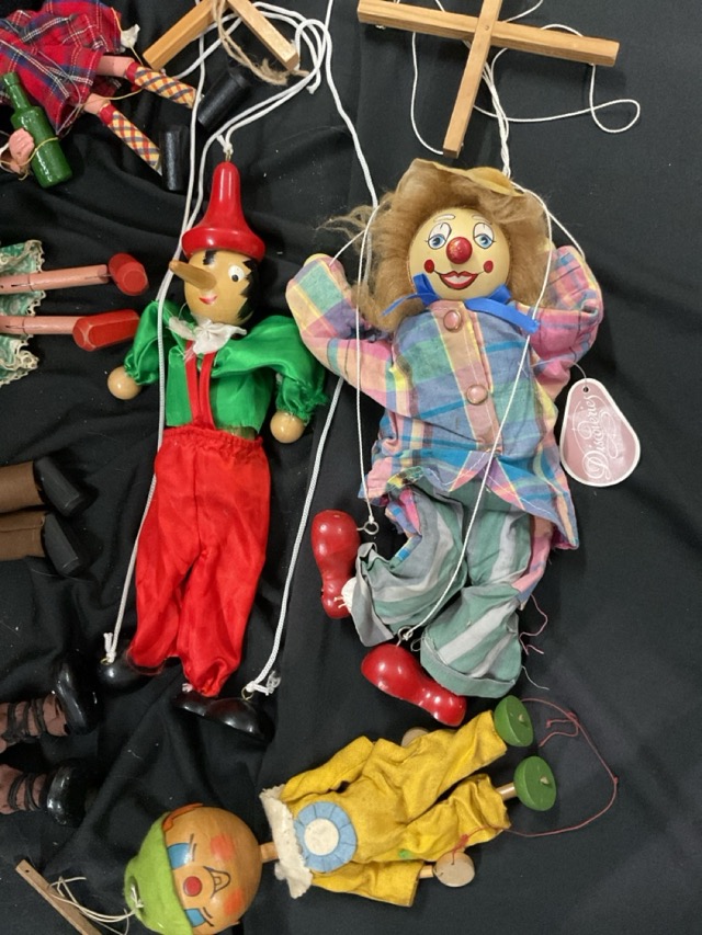 Five Pelham puppets - Mr MacBoozle, a black haired Mitzi, the Farmer, the Giant, and a clown; a painted wood Pinocchio with pointed red hat; and a Discoveries clown marionette with painted face. (7)