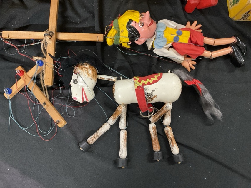 Three boxed Pelham puppets - the Schoolmaster, a blonde Mitzi, and a polka dot clown; an unboxed Pelham Muffin the Mule; and a Pinocchio puppet. (5)